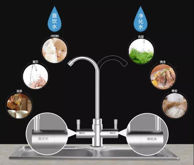 泉來凈水器(i3、i5、i8、V8、R8等)采用雙出水設計,兩條水路,雙控龍頭,一邊出凈化水,用來洗菜、煲湯、煮飯,一邊出直飲水,直接喝、沖奶粉、泡茶。